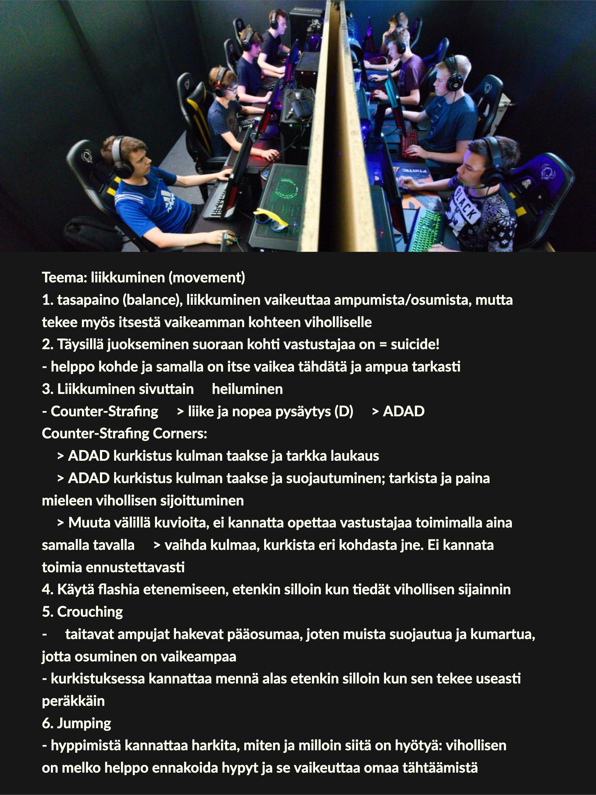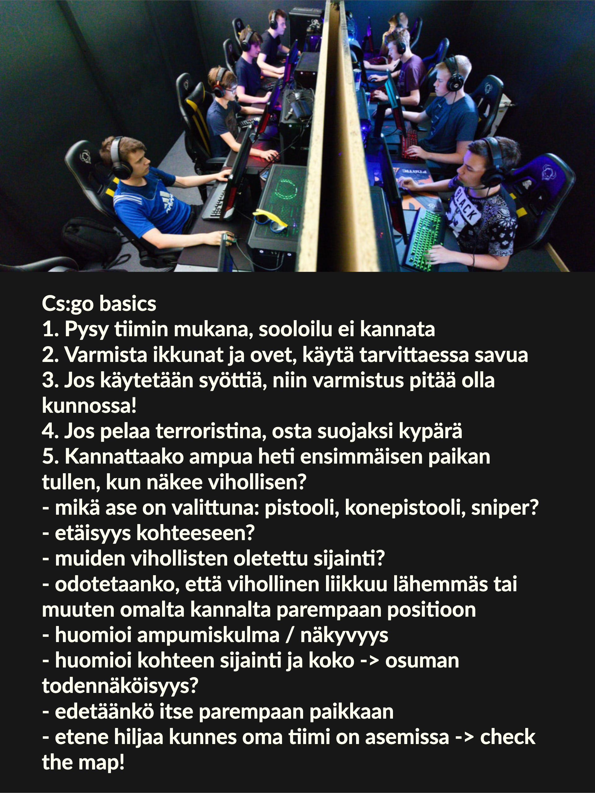 Teema: toiminta pareittain; vihollisen houkuttaminen 1. Savu tai kranaatti paljastaa sijainnin, joten heittäjän pitää olla suojassa – toinen pareista on sijoittunut hyvin eli on esteetön ampumalinja suojatusta… Read more ”CS:GO – basics”