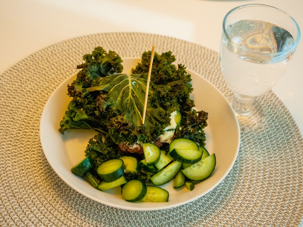 Tämä lehtikaalihampurilainen valmistettiin siten, että aluksi lehtikaalit keitettiin ja naudan jauhelista tehdyt pihvit paistettiin pannussa. Sen jälkeen hampurilainen kootaan lehtikaalen sisälle ja käytetään vielä uunissa hetken aikaa.