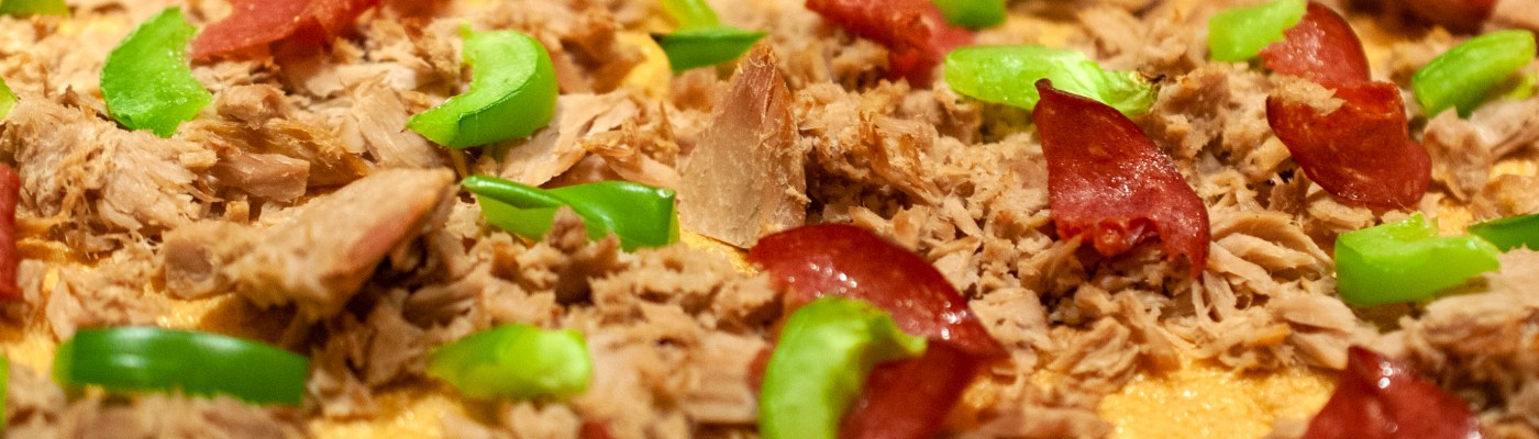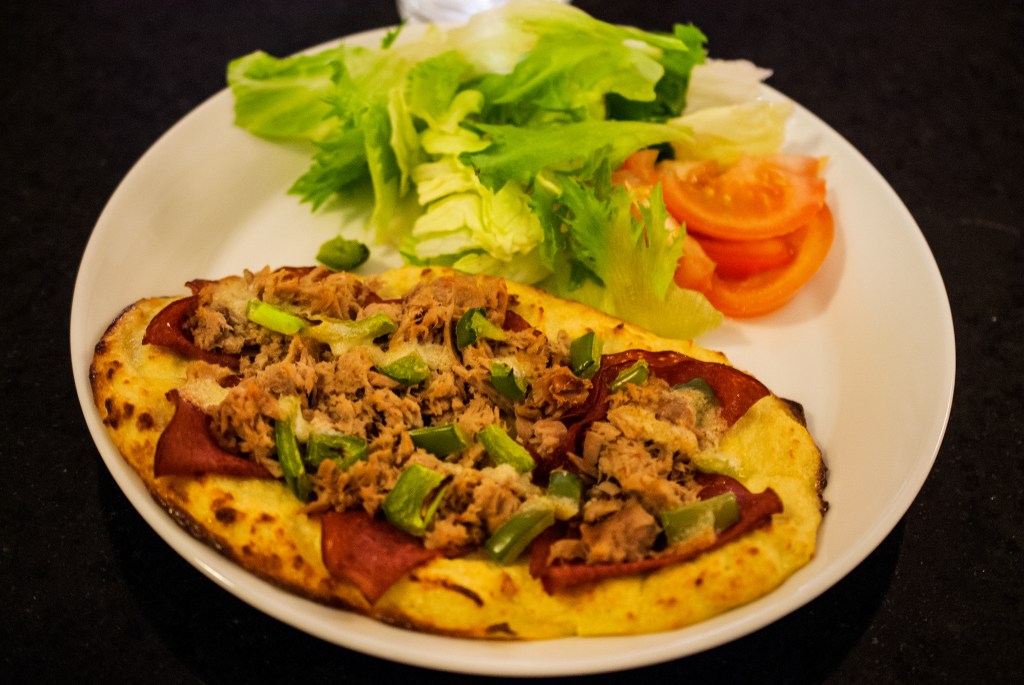 Tämä herkullinen meetwurstipizza sopii hyvin pizzaperjantain herkuksi. Pohja on tehty pääasiassa kukkakaalesta. Täytteinä tässä on käytetty ultrakevyttä meetwurstia, tonnikalaa ja paprikaa. Lisukkeena on vielä hieman salaattia ja tomaattia. Bon apetit!